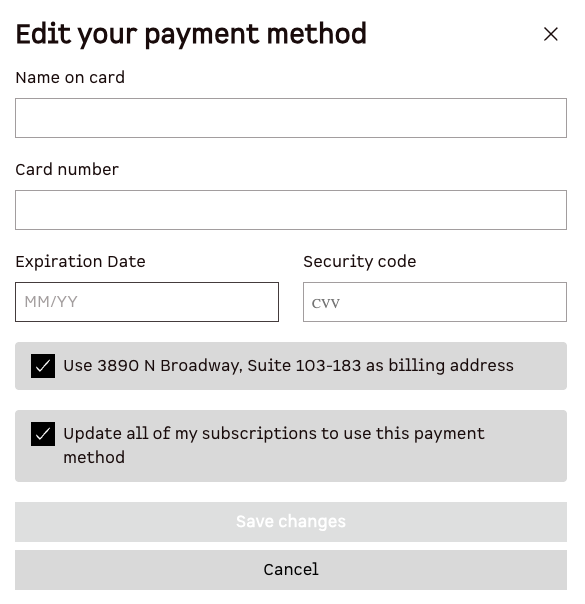 5. Once your new card information has been added, you can either keep the first box checked to use your current billing address, or uncheck it to enter a new one. Then check the 2nd box, "Update all of my subscriptions to use this payment method" if you would like to apply it to all subscriptions.